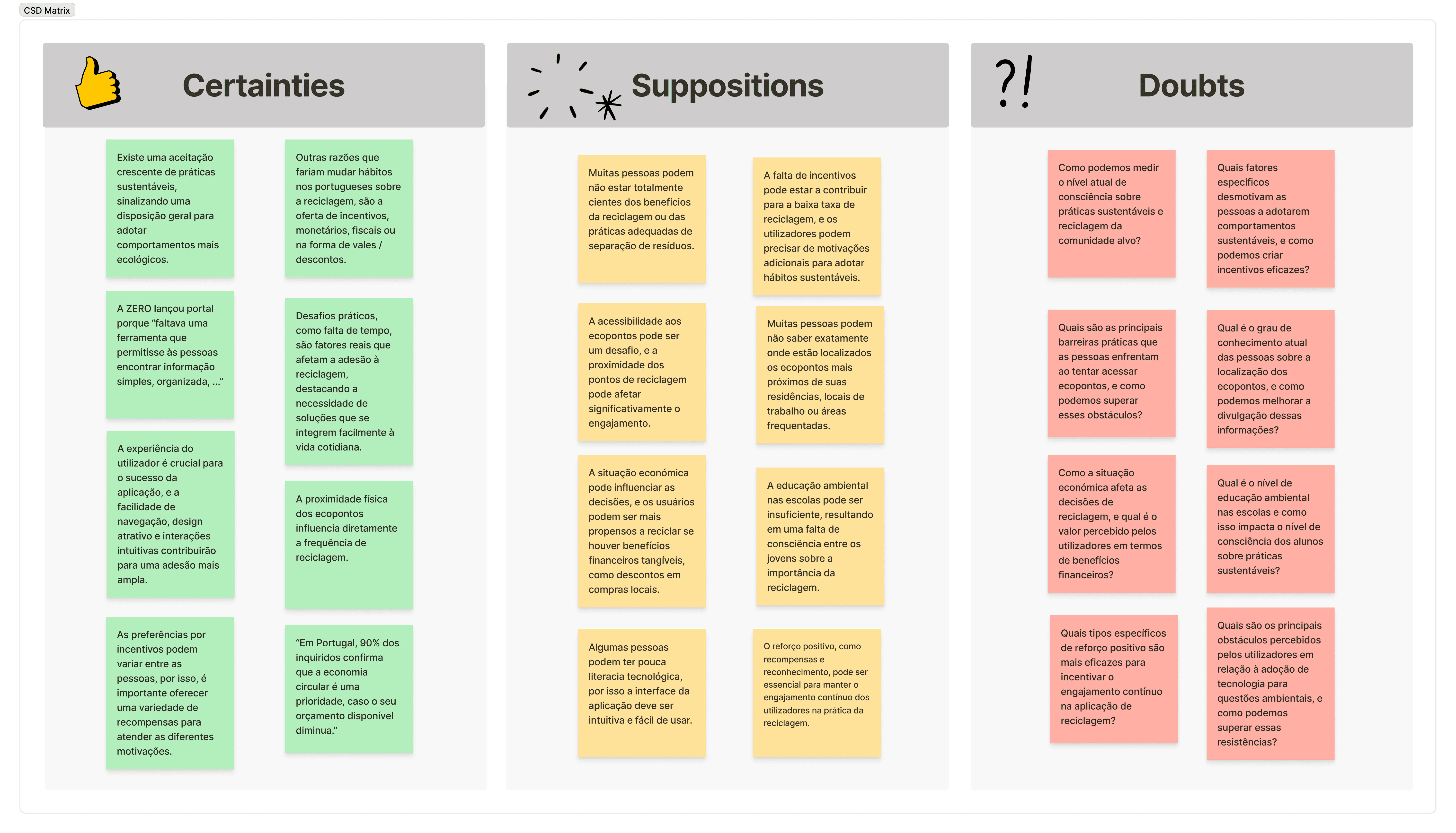 I created a CSD (Certainties, Suppositions, Doubts) Matrix to map user perceptions, surface knowledge gaps, and guide research and design decisions.