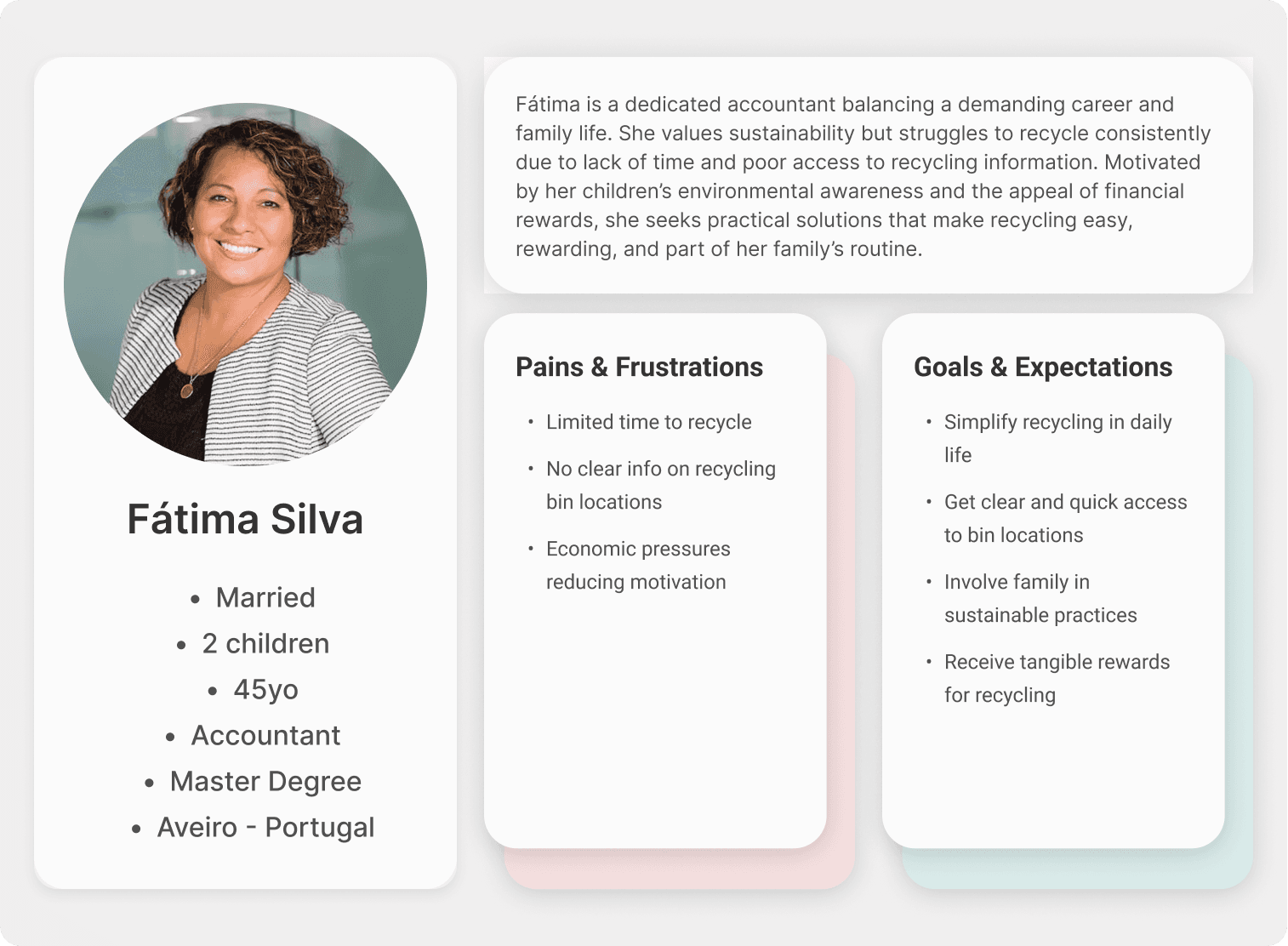To better understand EcoAveiro’s target users, I created personas that synthesise behavioural patterns, needs, and challenges. Fátima represents urban families who want to live more sustainably but face time constraints, lack of accessible recycling information, and financial pressures. This persona helped guide design decisions toward convenience, rewards, and education, ensuring the app responds directly to real user needs.