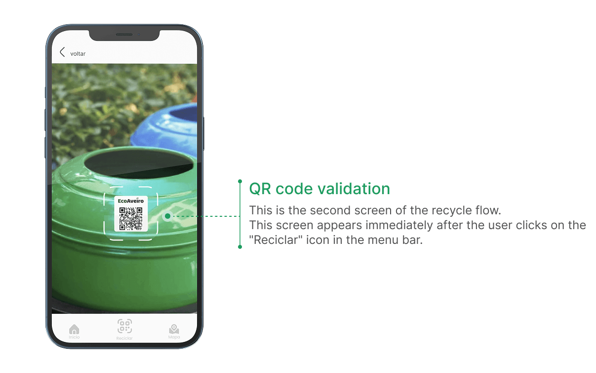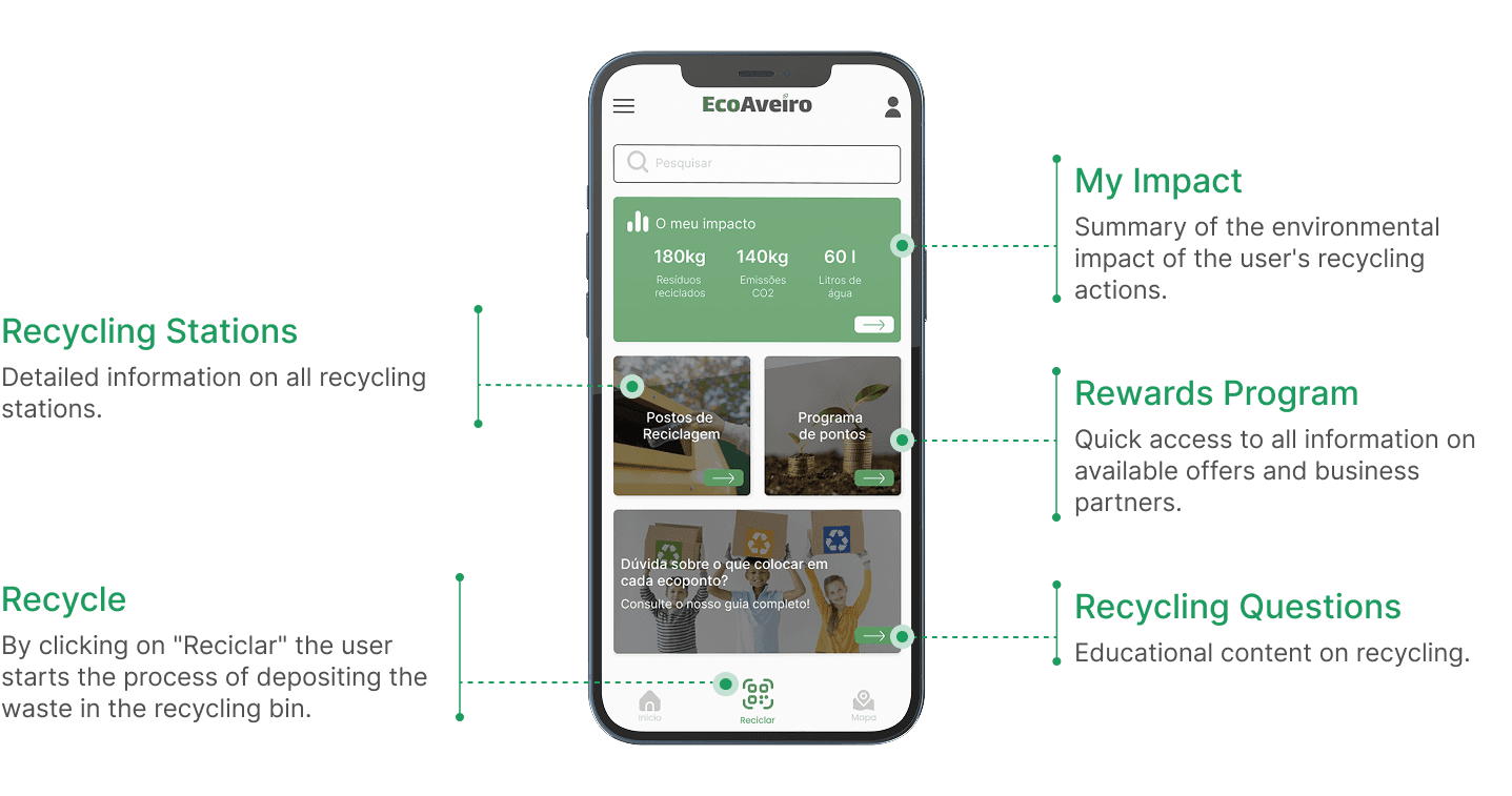 The EcoAveiro app validates waste deposits through an integrated Pay-As-You-Throw (PAYT) system. Smart recycling containers restrict access to authorised users who authenticate via the app.