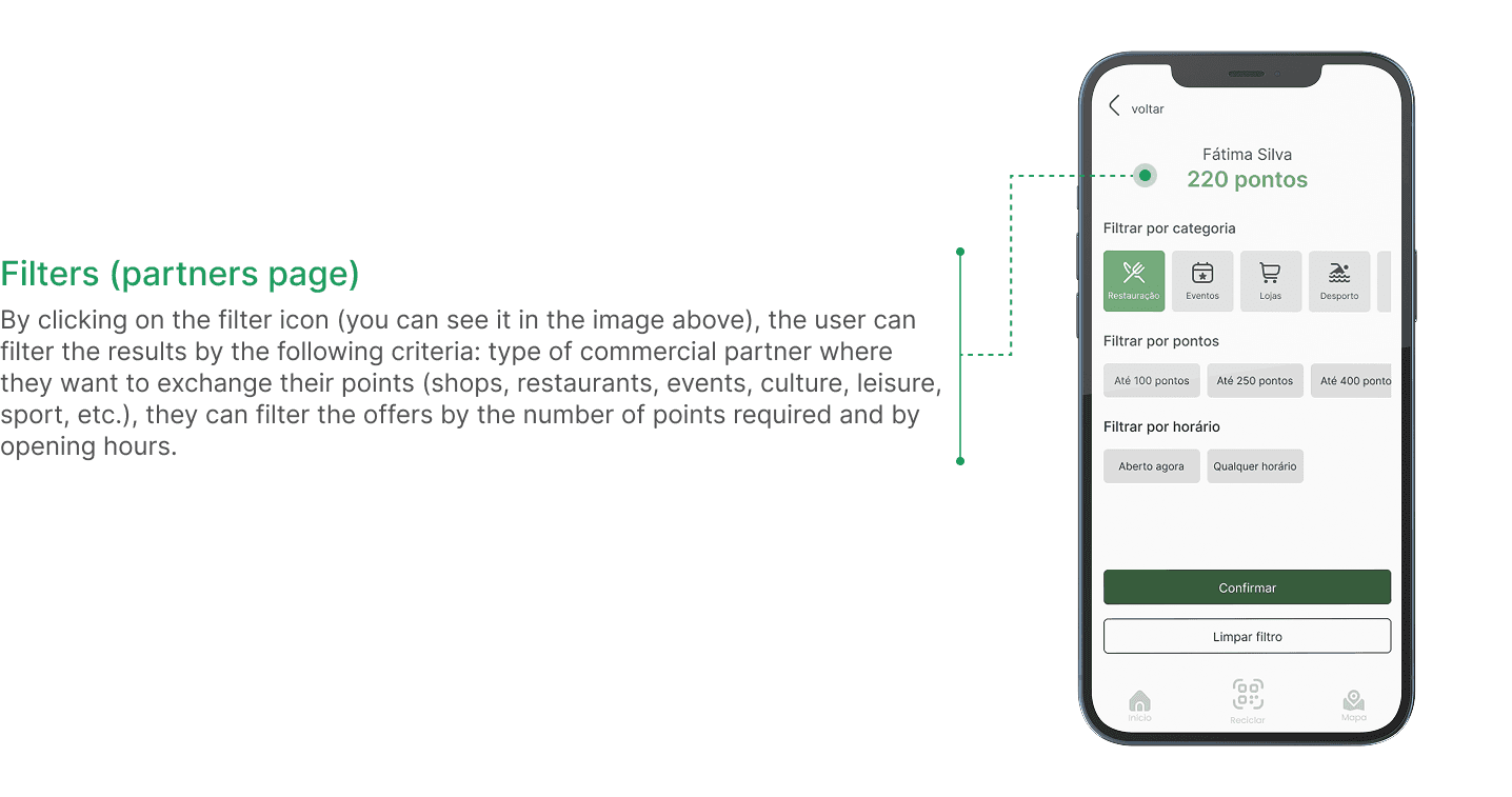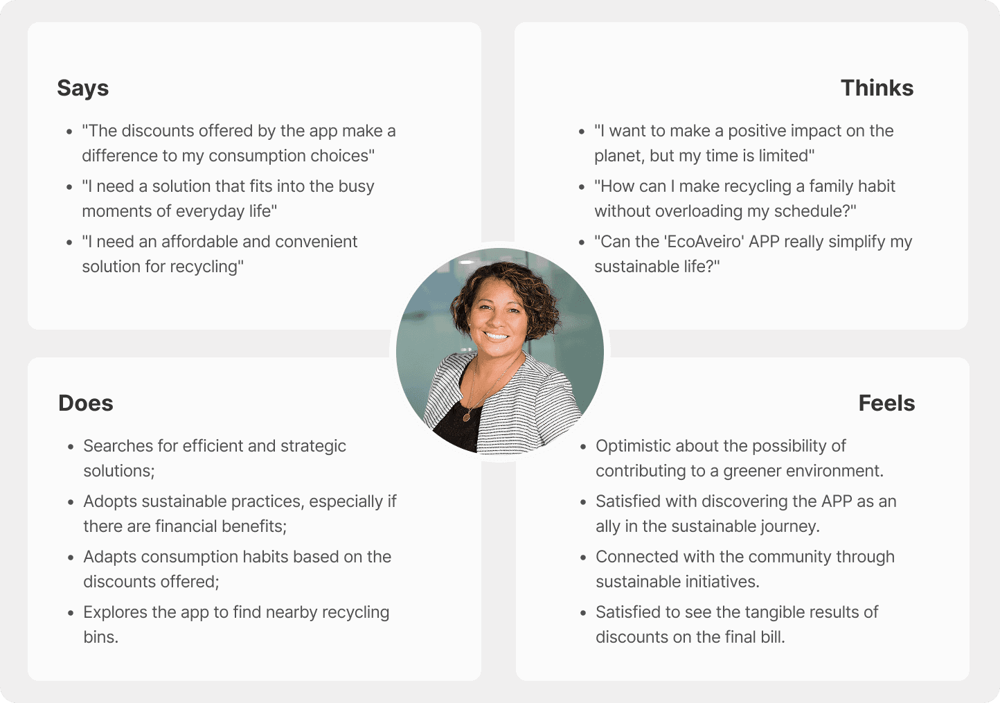 To better understand EcoAveiro’s target users, I created personas that synthesize behavioural patterns, needs, and challenges. Fátima represents urban families who want to live more sustainably but face time constraints, lack of accessible recycling information, and financial pressures. This persona helped guide design decisions toward convenience, rewards, and education, ensuring the app responds directly to real user needs.
