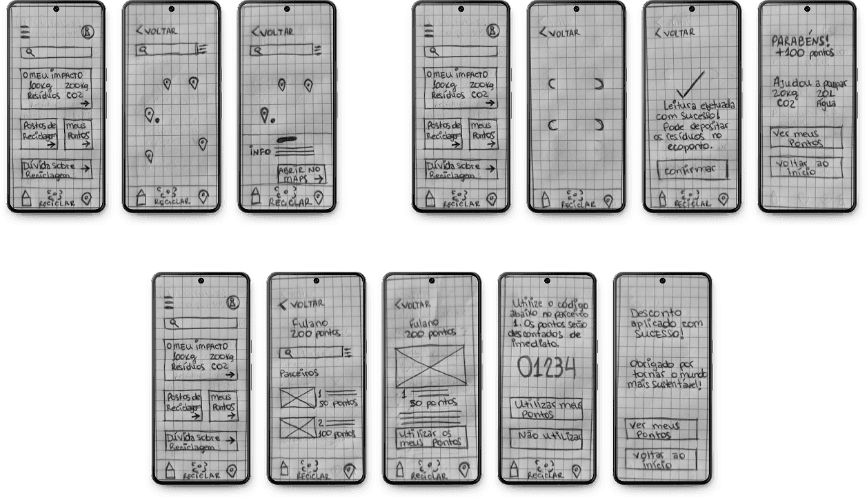 Initial wireframes were sketched to establish EcoAveiro's information architecture and user flow, then digitized into a low-fidelity interactive prototype using Marvel App. This iterative design approach facilitated rapid user testing and interface optimization based on usability feedback.